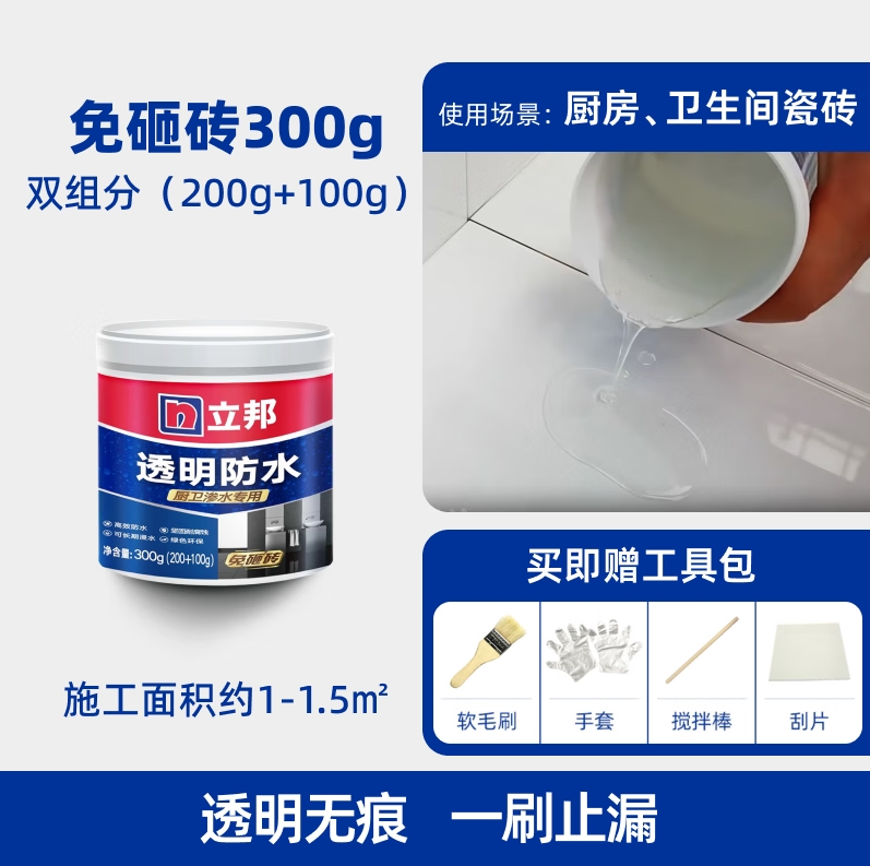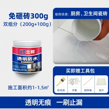• 商品名称:立邦透明防水胶免砸砖防水涂料卫生间厨房防水补漏材料透 明堵漏胶300g