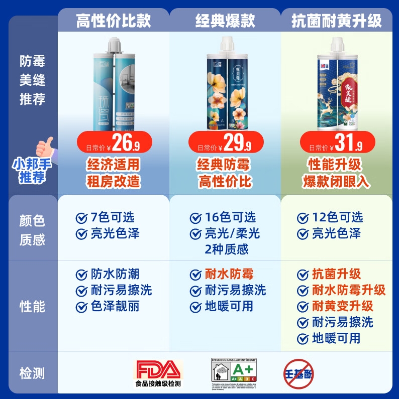 • 商品名称:立邦美缝剂防水防霉甄美缝瓷砖地砖填缝剂美缝胶专用工具勾缝剂 太空银【热销/亮面砖推荐】